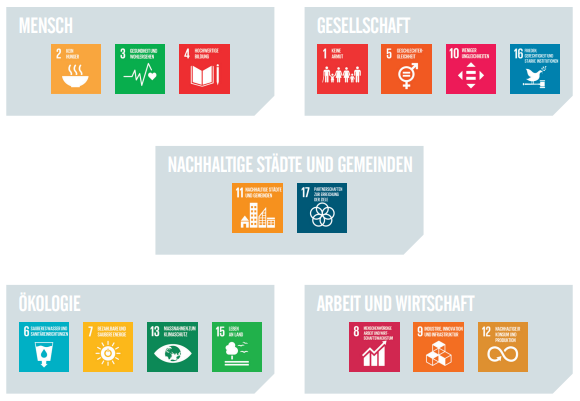 Um die Übersichtlichkeit zu erhöhen, empfiehlt es sich also, die einzelnen SDGs zu Schwerpunktthemen zusammenzufassen: Mensch, Gesellschaft (soziale Themen) Ökologie, Nachhaltige Städte & Gemeinden, Arbeit & Wirtschaft (Wirtschaftsrelevante Themen).