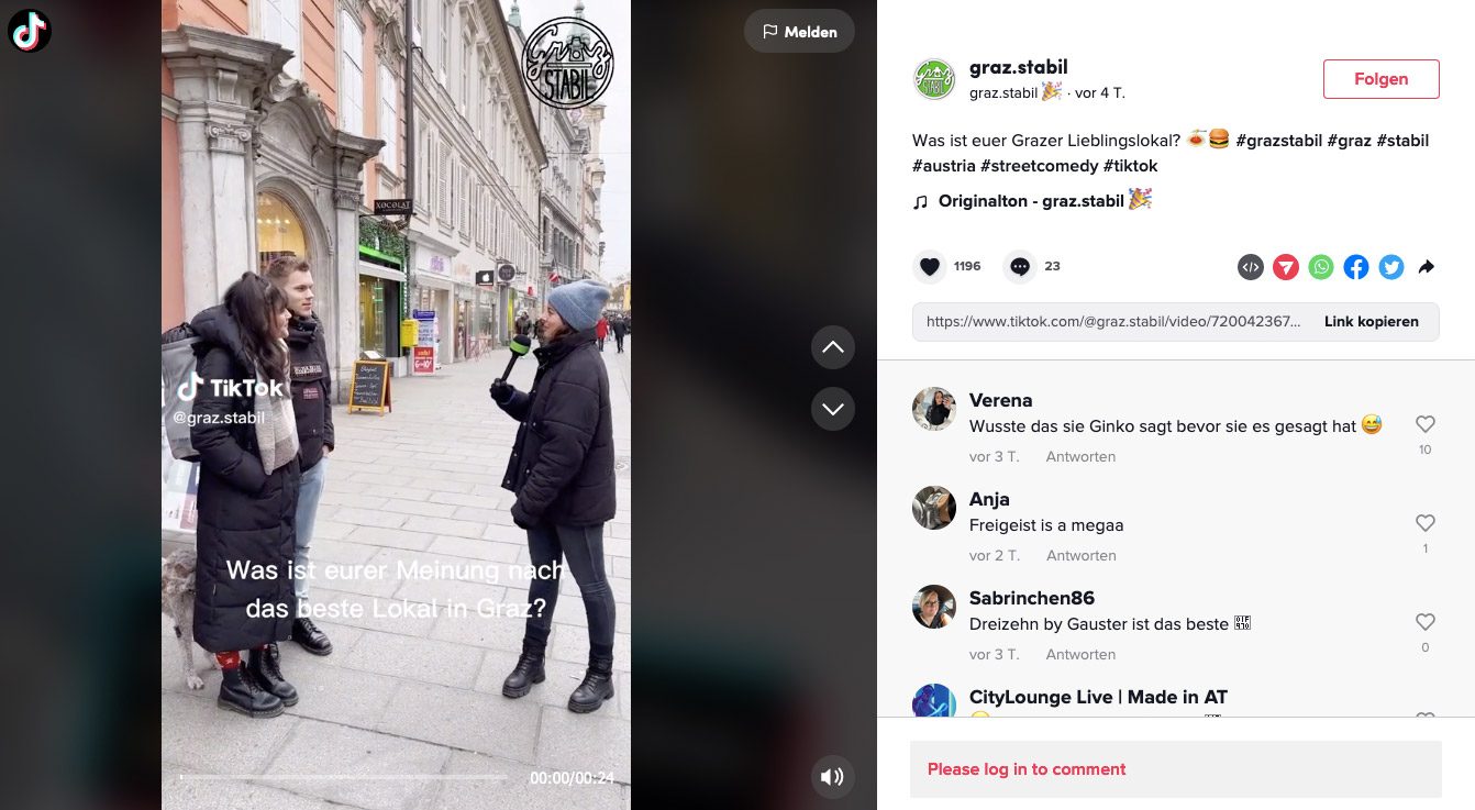 Fast 40.000 Menschen folgen dem Account. Zwar gibt es keine genauen Zahlen, aber es ist vorstellbar, dass für einige junge Leute die Stadt Graz erst damit auf der Landkarte der möglichen Orte zum Studieren oder Leben aufschien. So sorgt ein gut gemachter TikTok-Kanal für eine Umwegrentabilität, die den Standort abzusichern hilft.